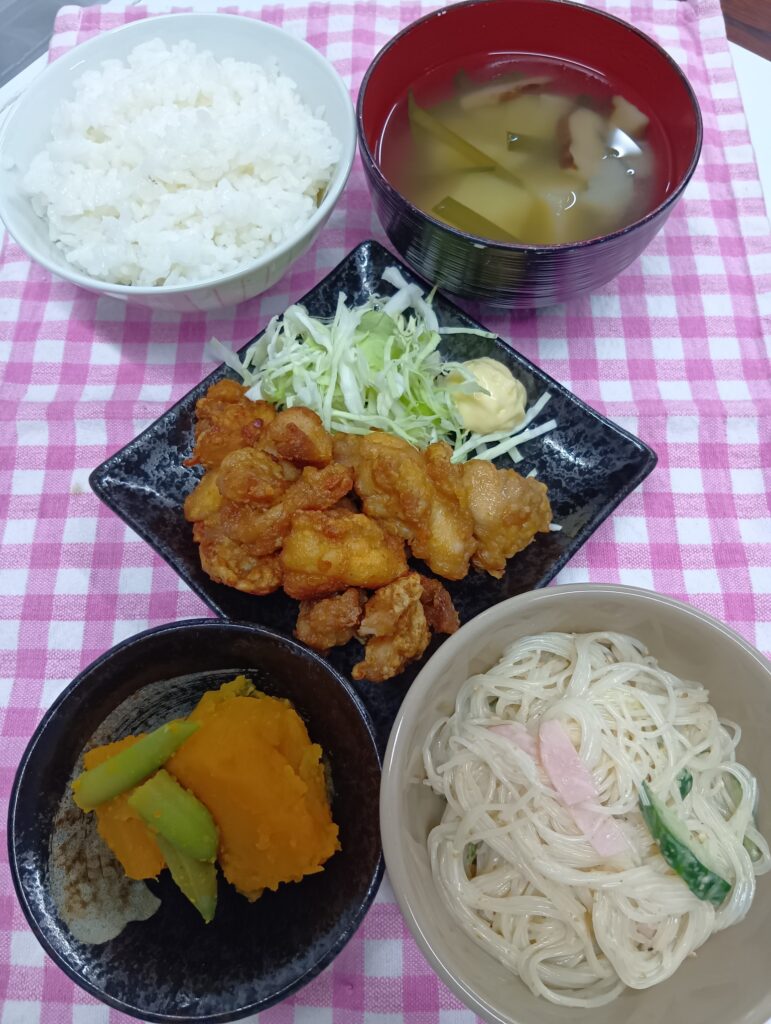 鶏唐揚げ、キャベツ千切り添え、ごま春雨サラダ、かぼちゃ煮付け、野菜スープ、ご飯