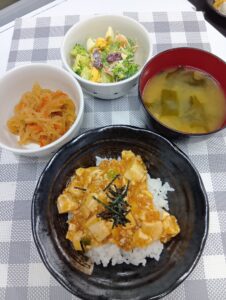 マーボ豆腐丼、玉子ブロッコリー🥦サラダ、切り干し大根、お味噌汁