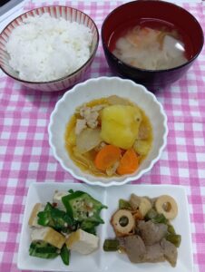 肉じゃが、おくら和物、こんにゃく味噌煮、ねぎスープ、ご飯