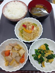 チャプチェ、菜の花ごま和え、煮物🍲、すまし汁、ご飯