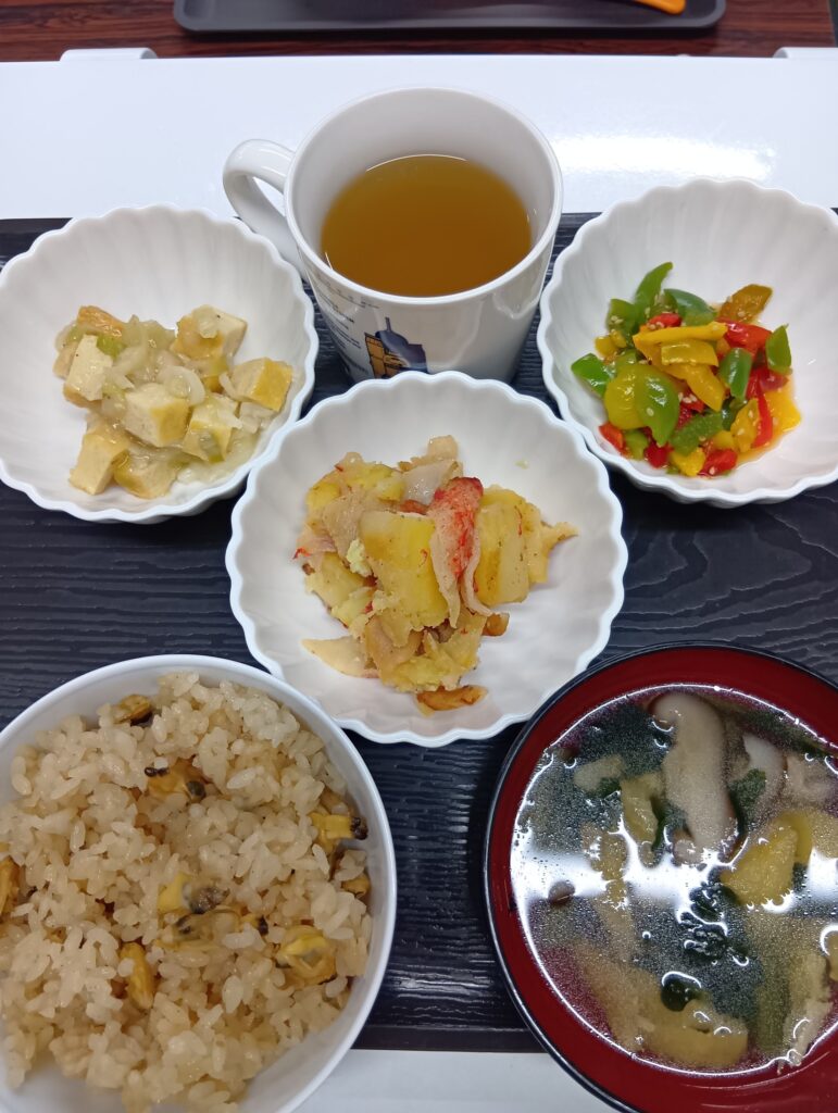 パプリカナムル,厚揚げネギ炒め、ポテトカニカマソテー、あさり炊き込みご飯、中華スープ