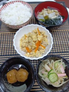 もやしサラダ、🐷豚玉子とじ、肉団子甘煮、コンソメスープ、ご飯