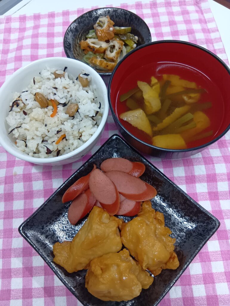 2025年10月18日 / 最終更新日時 : 2025年10月18日 hinokinomori3bell 今日のお昼ごはん 唐揚げ、竹輪おくら和え、ウインナーソテー、ひじきご飯、すまし汁FacebookXBlueskyHatenaCopy