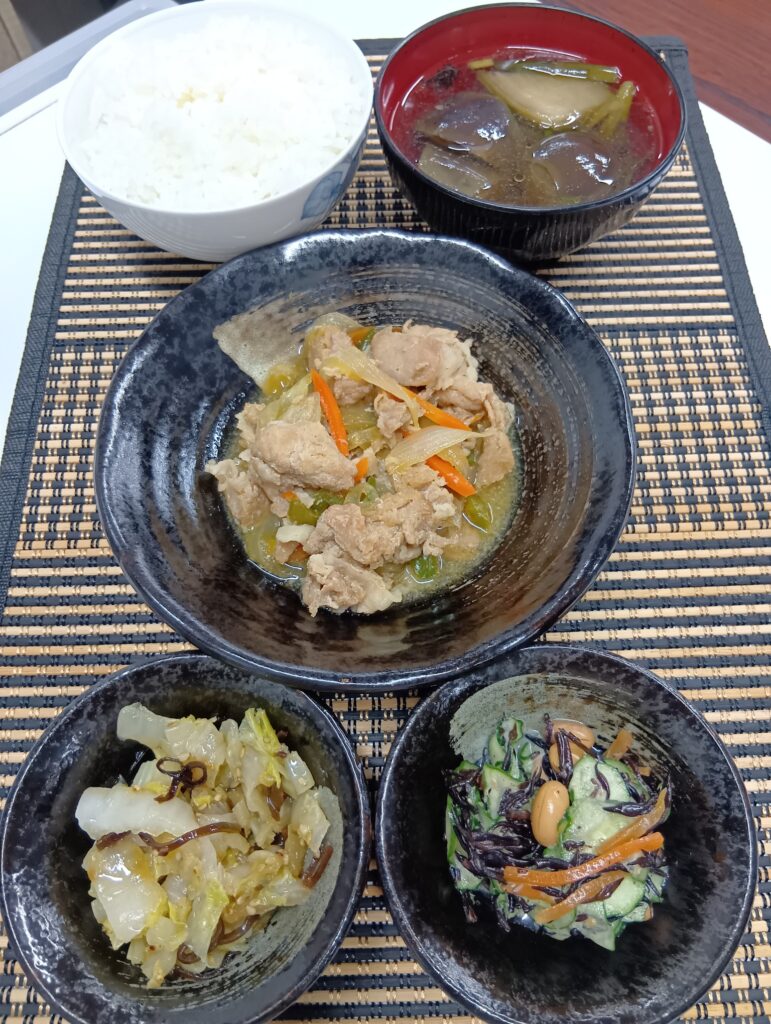 焼き肉炒め、ひじきサラダ、白菜ナムル、茄子汁、ご飯