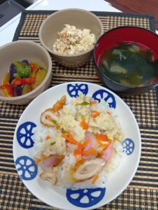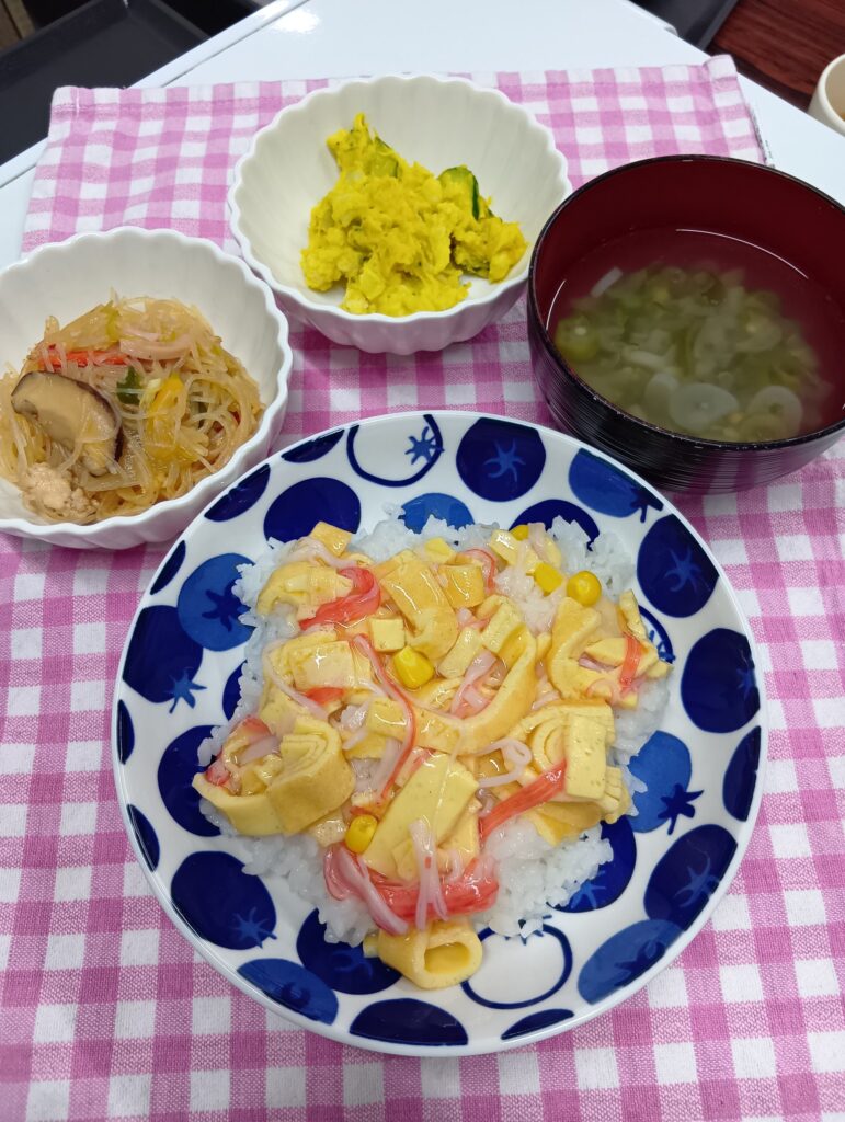 • 玉子餡掛け丼、かぼちゃサラダ、ビーフン、おくらスープ