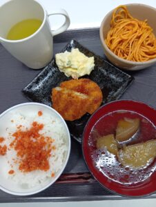 本日は鮭の日にちなんで鮭フレークをのせてみました😊コロッケ🧆、ミートパスタ🍝、玉子サラダ、茄子お汁、鮭ご飯