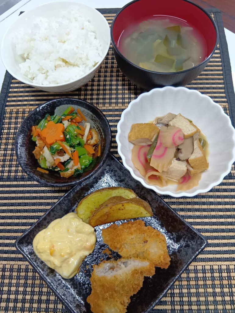 あじフライ、厚揚げ煮、ポテトフライ、小松菜おひたし、タルタルソース、あさりスープ、ご飯