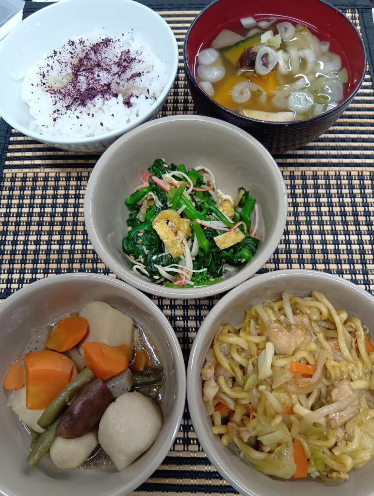 2025年11月24日 / 最終更新日時 : 2025年11月24日 hinokinomori3bell 今日のお昼ごはん 焼きそば、里芋煮、小松菜和え、ゆかりご飯、かぼちゃ汁FacebookXBlueskyHatenaCopy