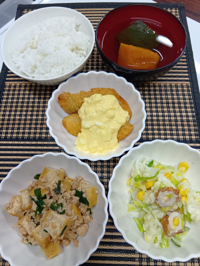 2025年12月5日 / 最終更新日時 : 2025年12月5日 hinokinomori3bell 今日のお昼ごはん フィッシュフライ、タルタルソースかけ、厚揚げ中華炒め、コールスローサラダ、かぼちゃ汁、ご飯FacebookXBlueskyHatenaCopy