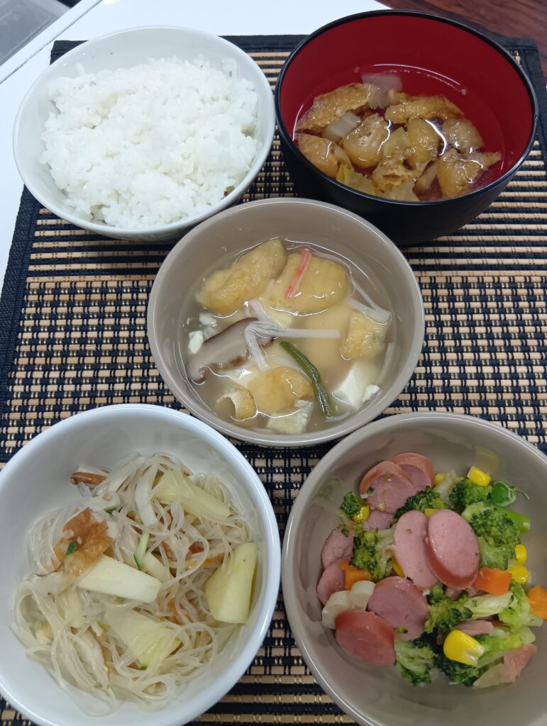 豆腐餡掛け煮、春雨サラダ、ブロッコリー🥦ウインナー炒め、すまし汁、ご飯