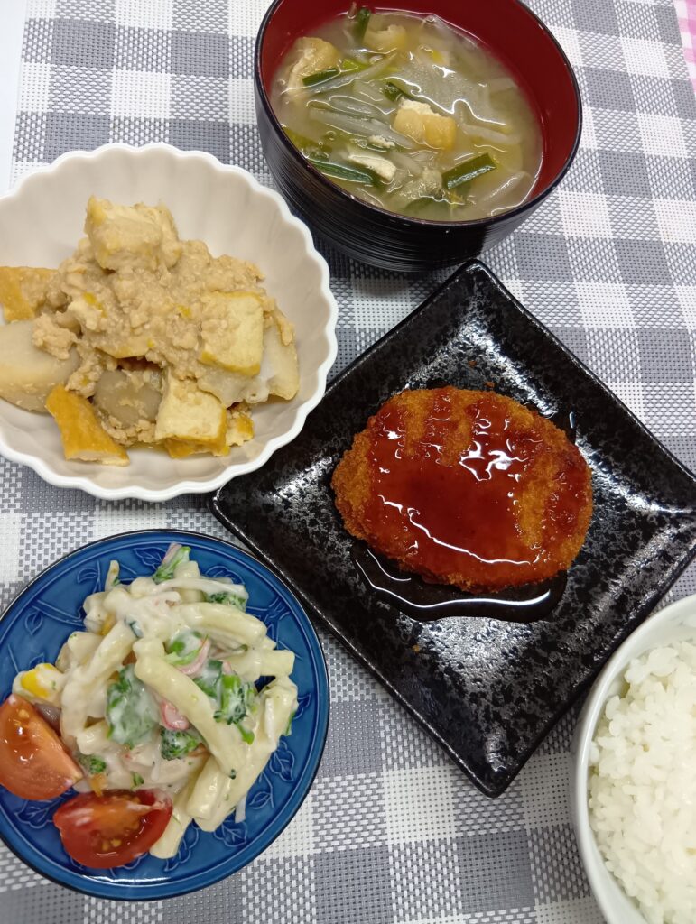 コロッケ 野菜マカロニサラダ 里芋ゆず煮物 みそ汁 ご飯