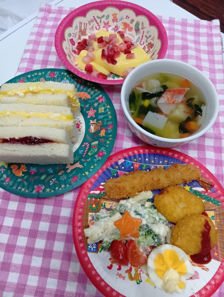 2025年12月25日 / 最終更新日時 : 2025年12月25日 hinokinomori3bell 今日のお昼ごはん MerryXmas🎅ランチ🎄玉子サンド、ジャムサンド、ゆで卵、サラダ🥗、海老フライ🍤、ナゲット、プリン🍮イチゴ🍓トッピングFacebookXBlueskyHatenaCopy