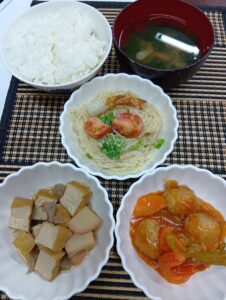 • 甘酢肉団子🧆、厚揚げ煮物🍲、春雨サラダ🥗、小松菜スープ、ご飯