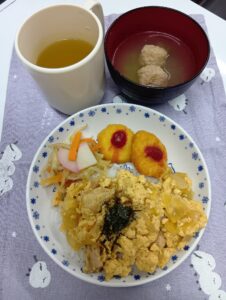 • 親子丼、もやしかまぼこ柚子ポン酢和え、ナゲットチキン、肉団子スープ