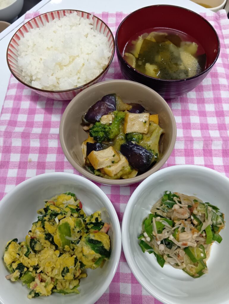 2026年1月13日 / 最終更新日時 : 2026年1月13日 hinokinomori3bell 今日のお昼ごはん 茄子と厚揚げ中華炒め、ほうれん草玉子ソテー、おくらえのきおかか和え、ネギわかめスープ、ご飯FacebookXBlueskyHatenaCopy