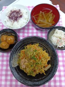 • 焼きそば、大根マヨネーズサラダ、甘辛肉団子煮🧆、大根お汁、ゆかりかけご飯