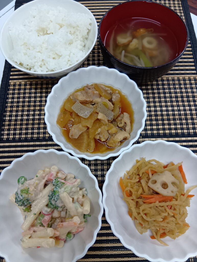 • 鶏大根煮物、蓮根切り干し大根、オーロラソースマカロニサラダ、コンソメスープ、ご飯