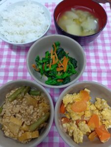 • 厚揚げひき肉ピリ辛炒め、菜の花柚子の風味和え、人参🥕しりしり、野菜スープ🍲、ご飯