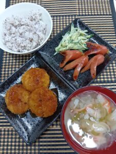 ホタテクリームコロッケ🧆きゅうり🥒サラダ、焼きウインナー、ゆかり混ぜご飯、中華春雨スープ🍲
