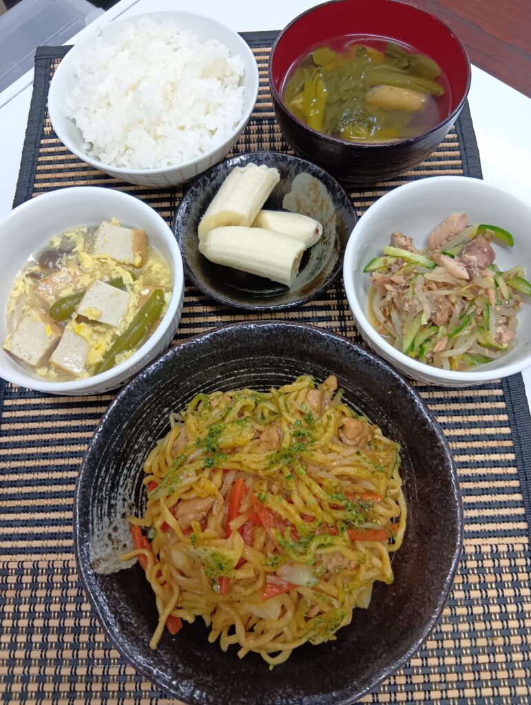 • 焼きそば、厚揚げ玉子とろとろ煮、鯖きゅうり🥒和物、菜の花汁、ご飯、バナナ🍌