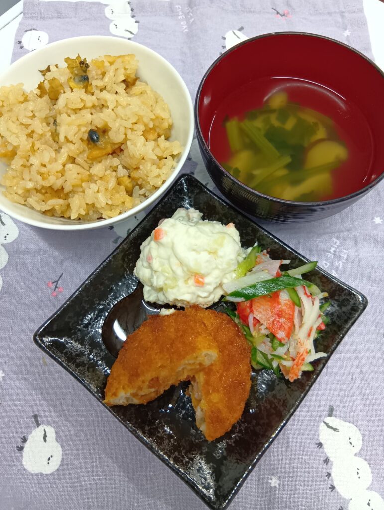 2026年3月14日 / 最終更新日時 : 2026年3月14日 hinokinomori3bell 今日のお昼ごはん えびカツ、カニカマきゅうり🥒和え、ポテト🥔サラダ、あさり炊き込みご飯、きのこ🍄スープFacebookXBlueskyHatenaCopy