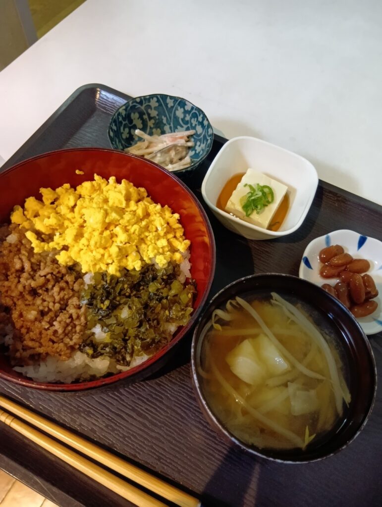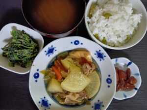 大根と厚揚げの煮物、ほうれん草の胡麻和え、うずら豆、味噌汁