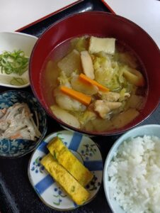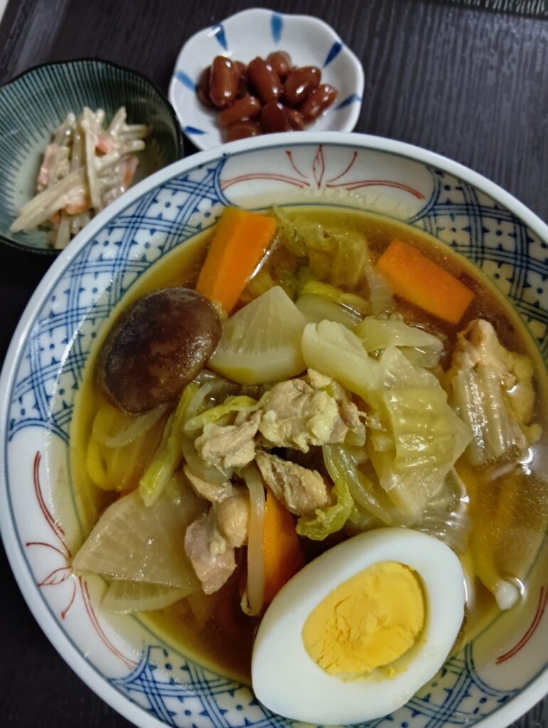 白菜と豚肉の旨煮、玉子焼き、ごぼうサラダ、冷奴