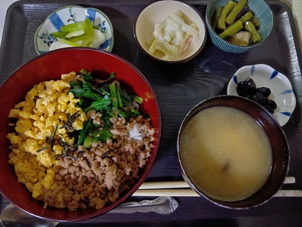 2025年12月15日 / 最終更新日時 : 2025年12月15日 nerimamatsu3bell 今日のお昼ごはん 三色丼セットかぶの浅漬マカロニサラダなすといんげんの煮浸し黒豆なめこ汁FacebookXBlueskyHatenaCopy