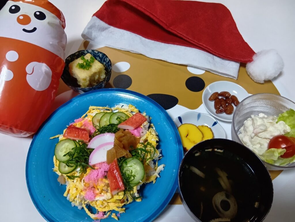 2025年12月25日 / 最終更新日時 : 2025年12月25日 nerimamatsu3bell 今日のお昼ごはん クリスマスメニューちらし寿司、伊達巻、揚げだし豆腐、サラダ、うずら豆、お吸い物FacebookXBlueskyHatenaCopy