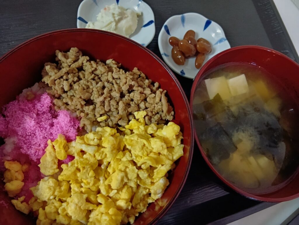 2025年12月28日 / 最終更新日時 : 2025年12月28日 nerimamatsu3bell 今日のお昼ごはん 三色丼、ポテトサラダ、うずら豆、味噌汁FacebookXBlueskyHatenaCopy